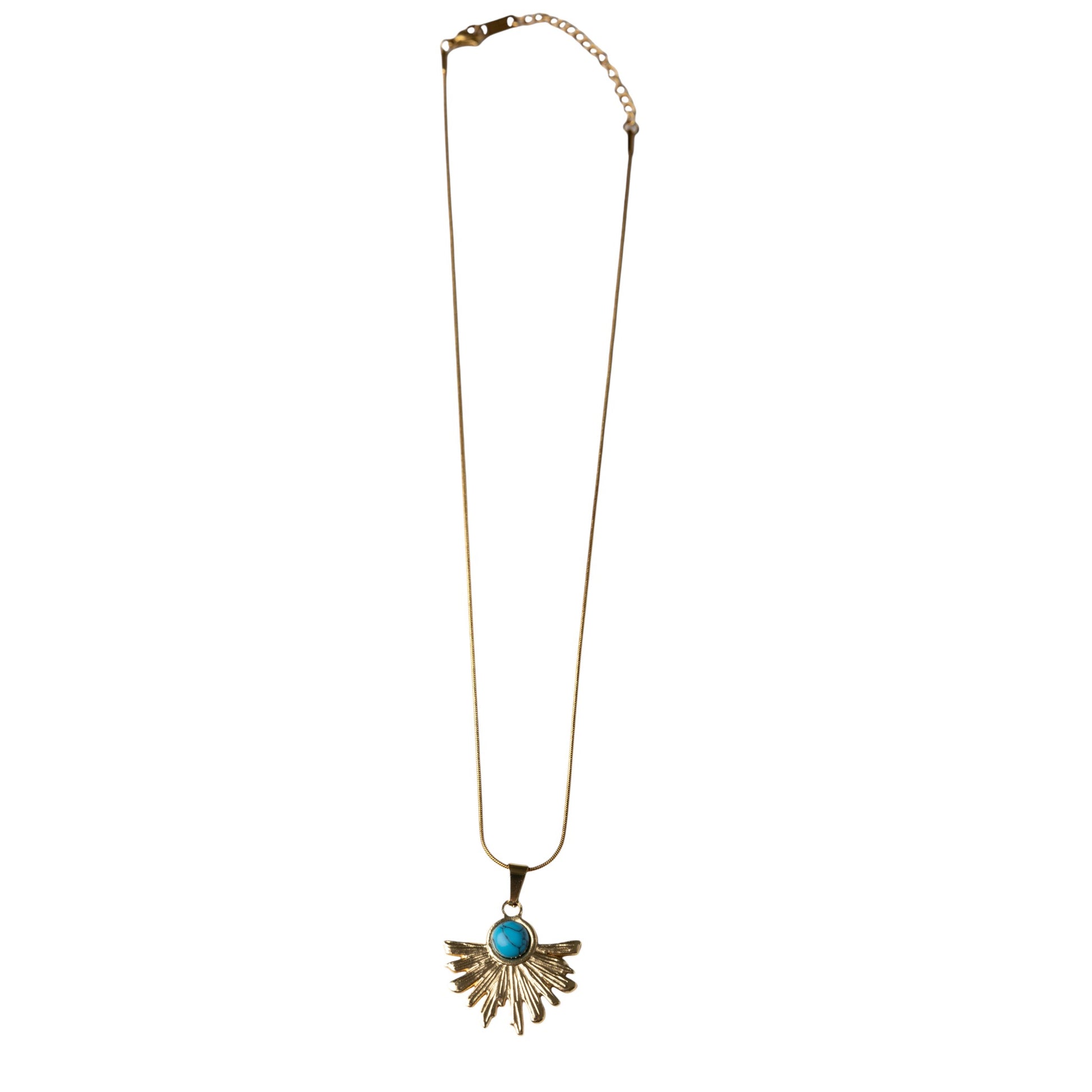 Like sunlight reflecting over tranquil waters, the Aqua Ray Necklace brings warmth and serenity in one design. The sun-inspired pendant radiates golden rays, while the central turquoise stone captures the calm of the ocean. Made from stainless steel with 14K gold plating, it balances durability with elegance – a versatile piece that transitions effortlessly from day to night.