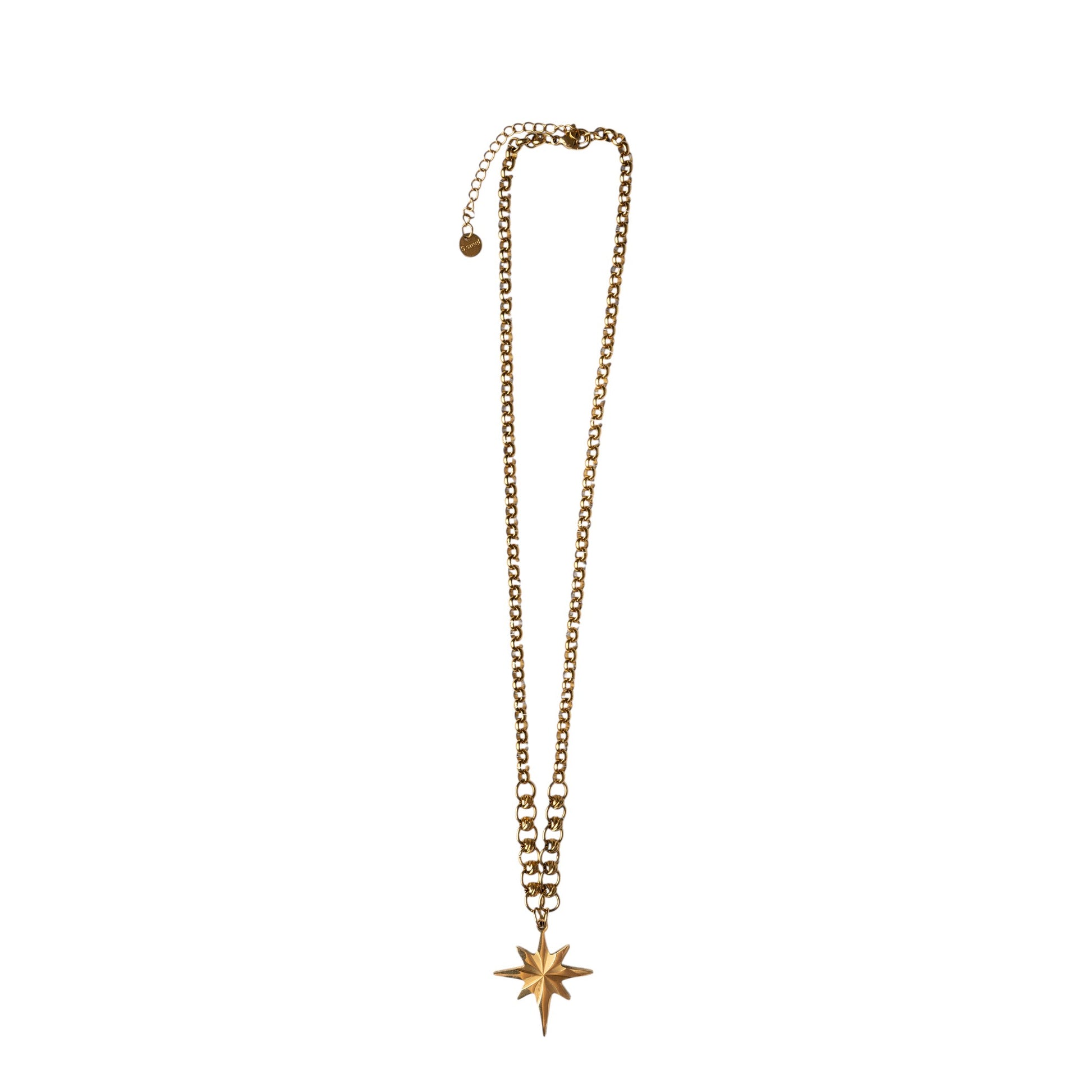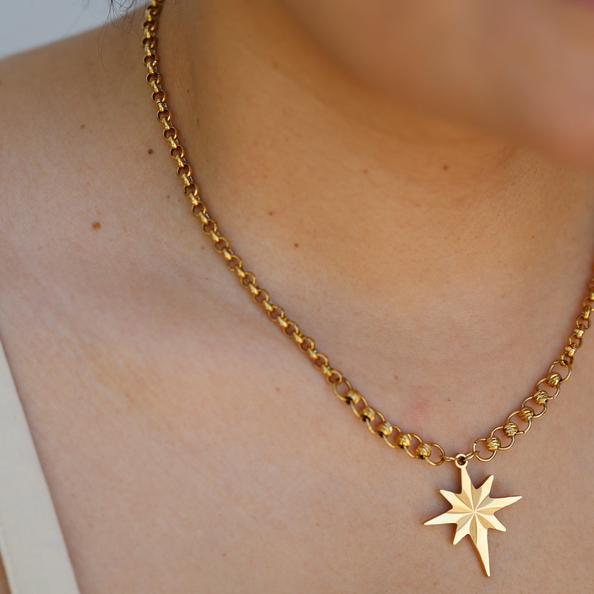 A tribute to the guiding stars, the Astra Necklace combines strength and elegance in one timeless piece. Its bold star pendant symbolizes direction and inner power, while the chunky chain adds a modern edge. Crafted from durable stainless steel with 14K gold plating, it’s designed to shine season after season—whether worn solo for impact or layered with delicate chains for a statement style.
