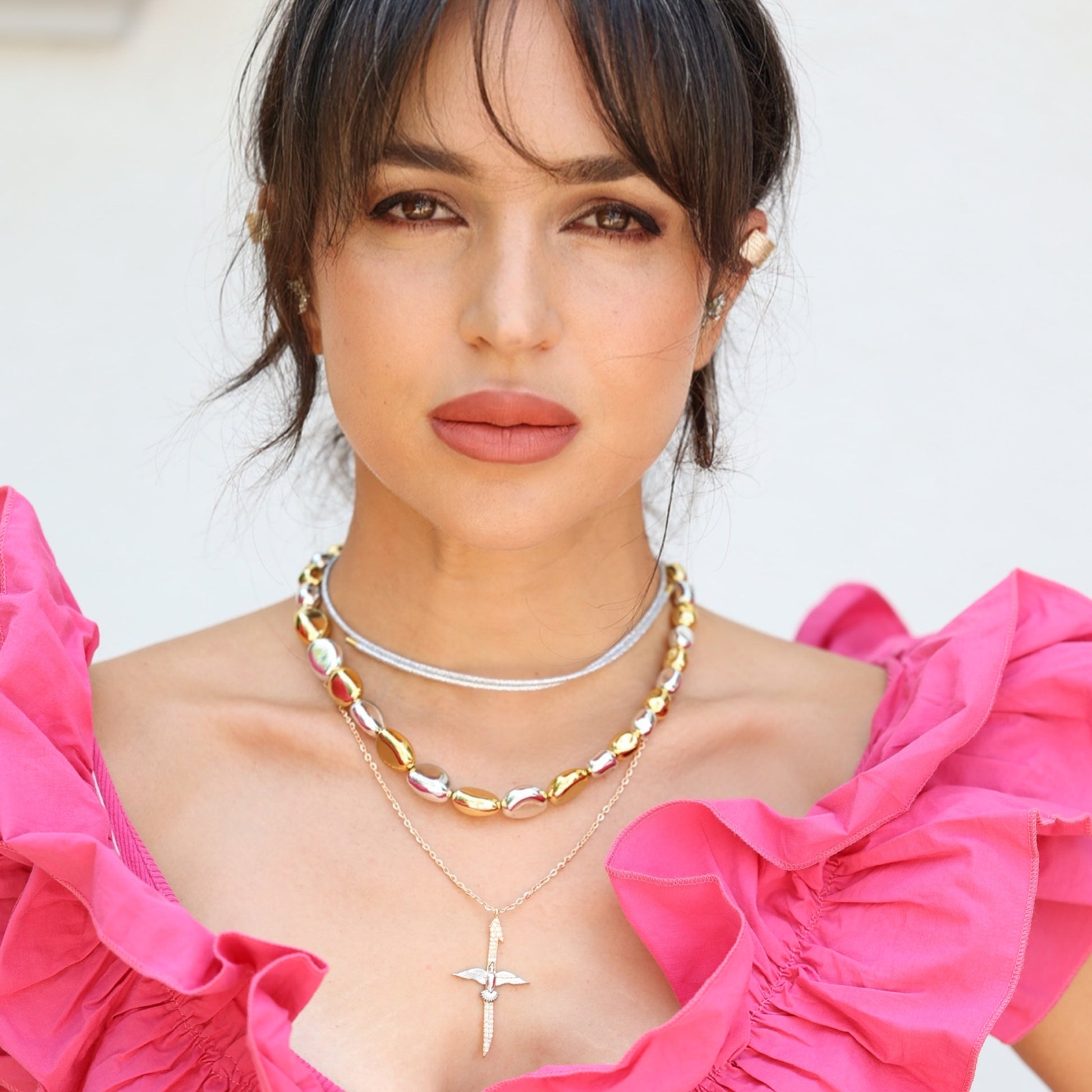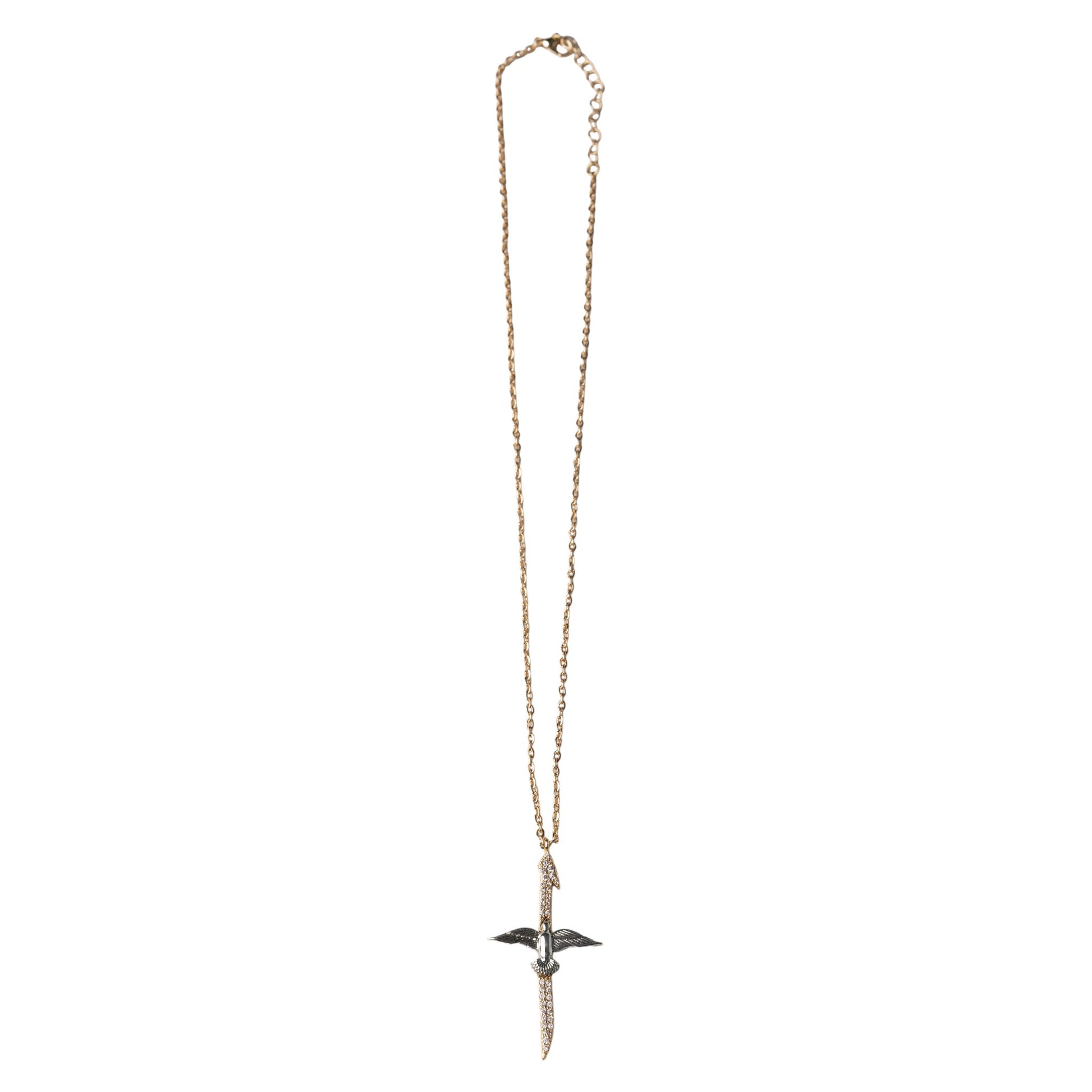 A symbol of strength guided by the heavens – the Celestia Necklace blends power and grace in one design. The sword, shimmering with micro zircon stones, represents courage, while the silver-toned wings wrapped around it bring a celestial aura of protection. Hanging from a radiant gold-plated chain, this necklace is more than jewelry—it’s a statement of inner strength and divine elegance.