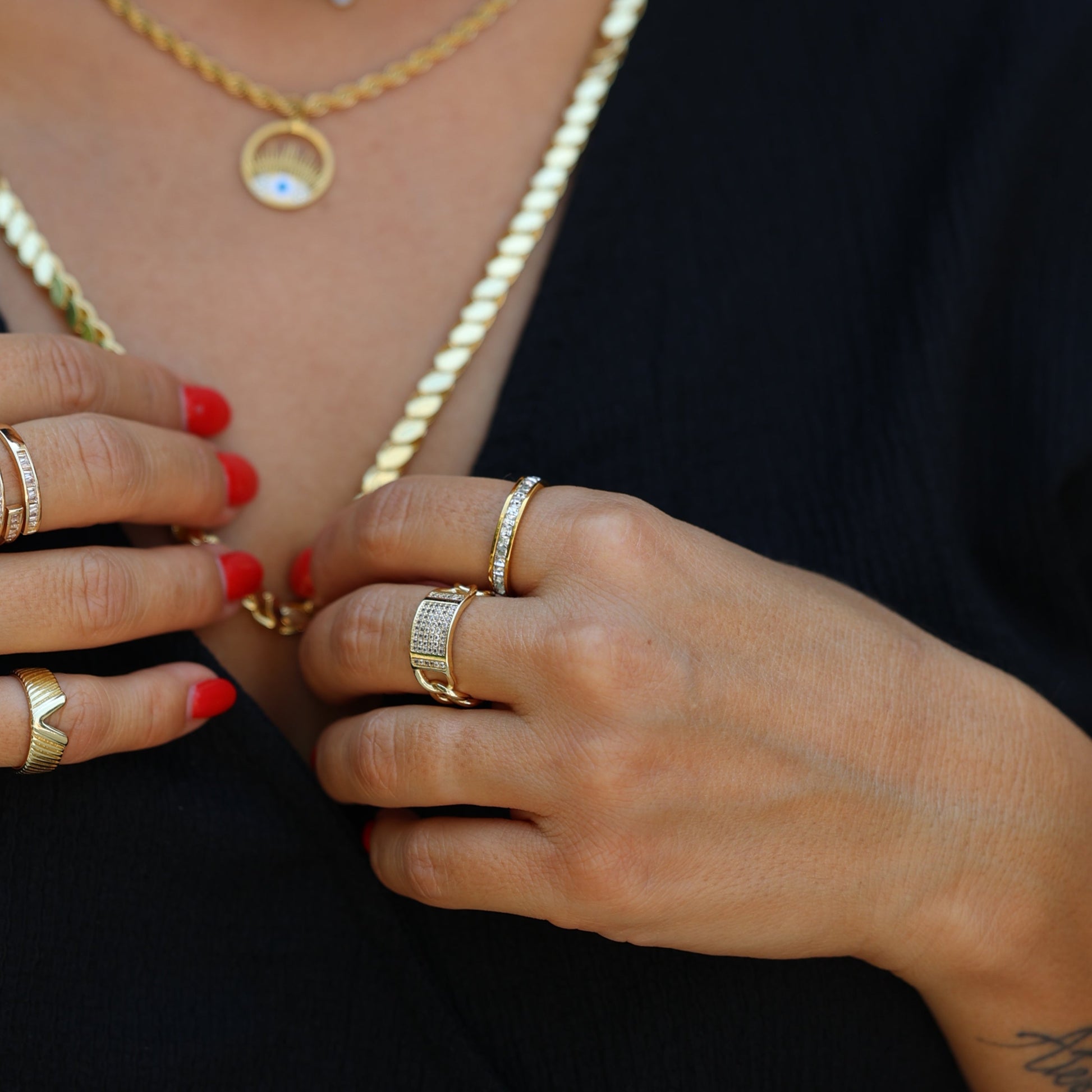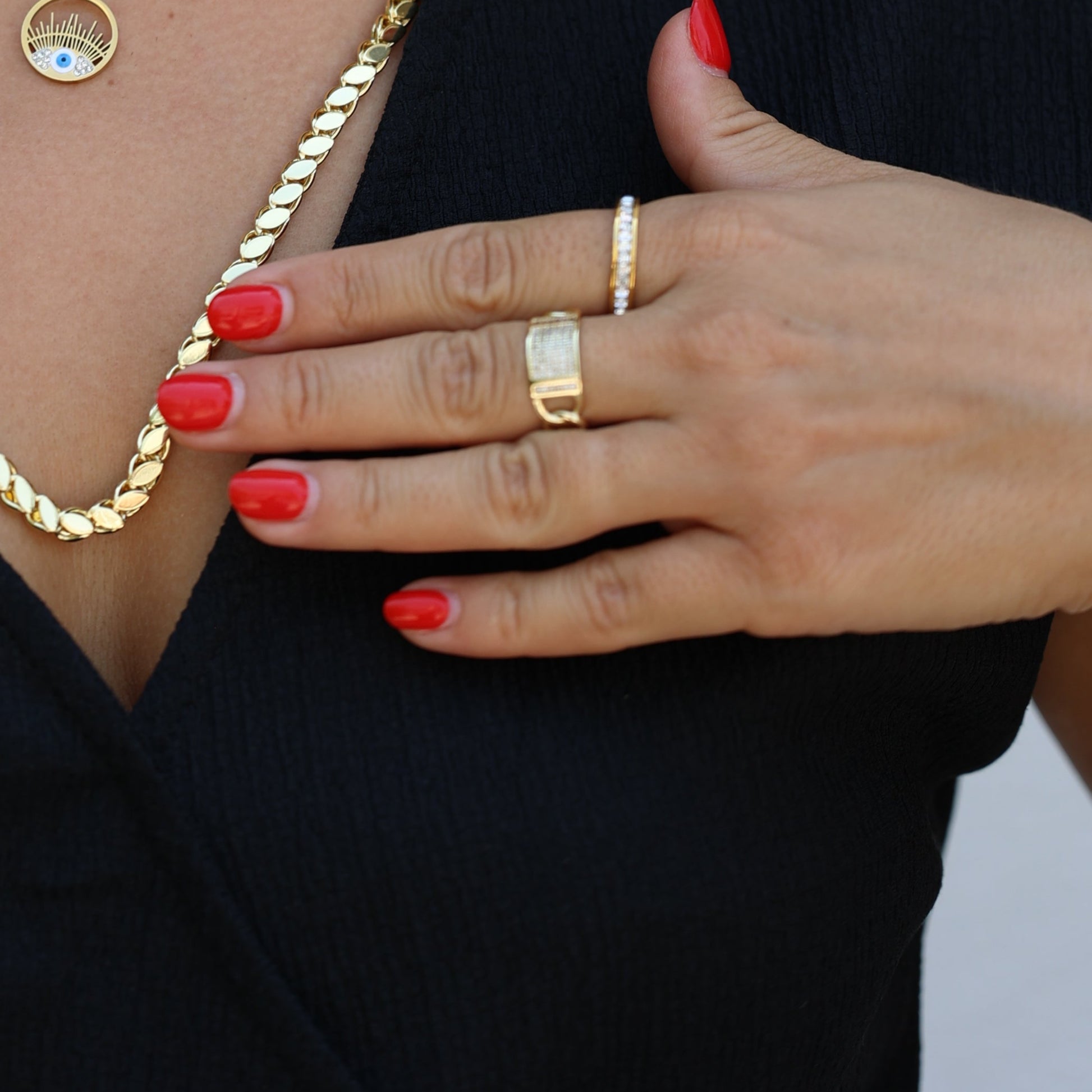The Halo Ring reflects pure elegance in its simplest form. With a sleek gold-plated band set with sparkling white zircons, it offers just the right amount of shine for both everyday wear and special occasions. Minimal yet radiant, this piece is designed to be a classic staple in every jewelry collection.