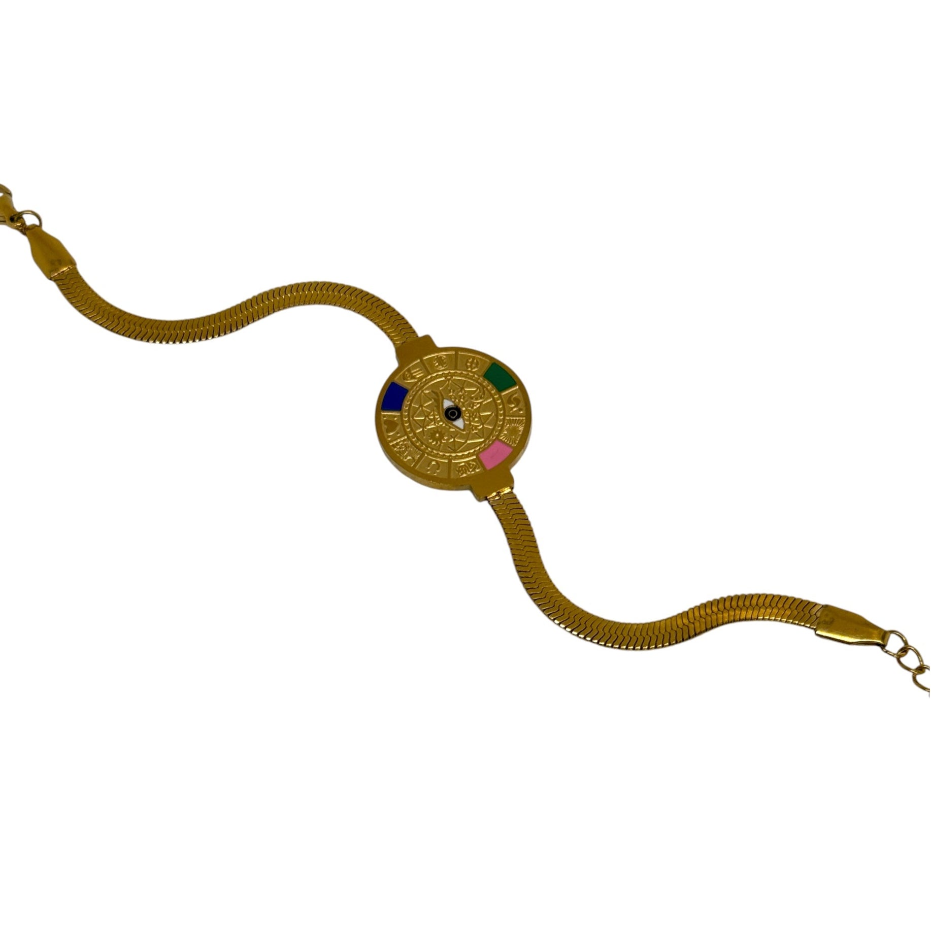 The Iris Bracelet is designed as a modern talisman, bringing together beauty and meaning. Its central disc features an enamel evil eye surrounded by embossed symbols and vibrant tones of blue, green, and pink enamel. With its adjustable strap, this bracelet combines comfort, style, and symbolism, making it a unique piece to wear daily.