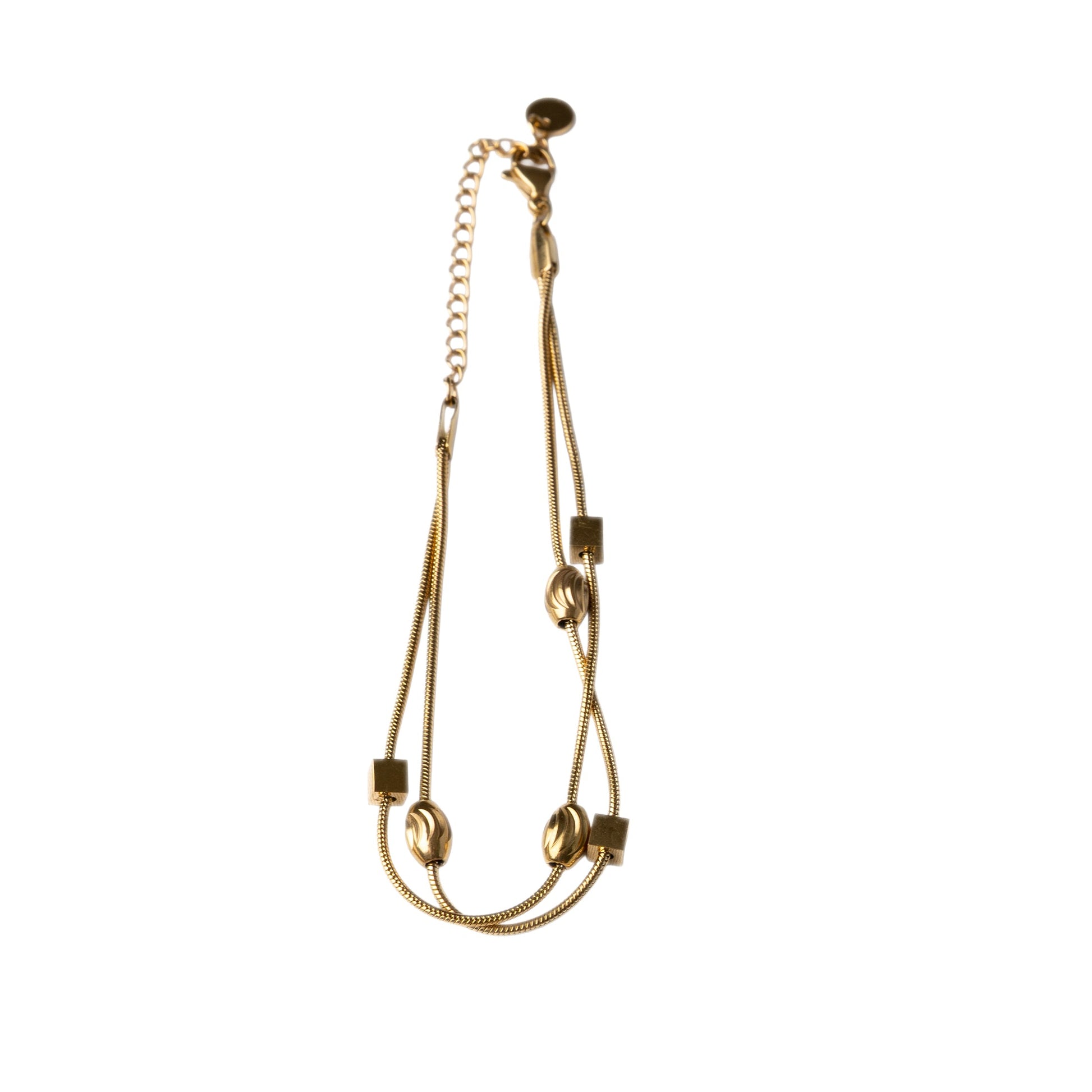 The Lyra Bracelet is a refined statement of contemporary elegance. Crafted from high-quality stainless steel and finished with 14K gold plating, this design features two sleek chains adorned with geometric cube accents and twisted round details. The combination of structured and fluid shapes creates a bold yet graceful piece, perfect for both everyday wear and elevated occasions.