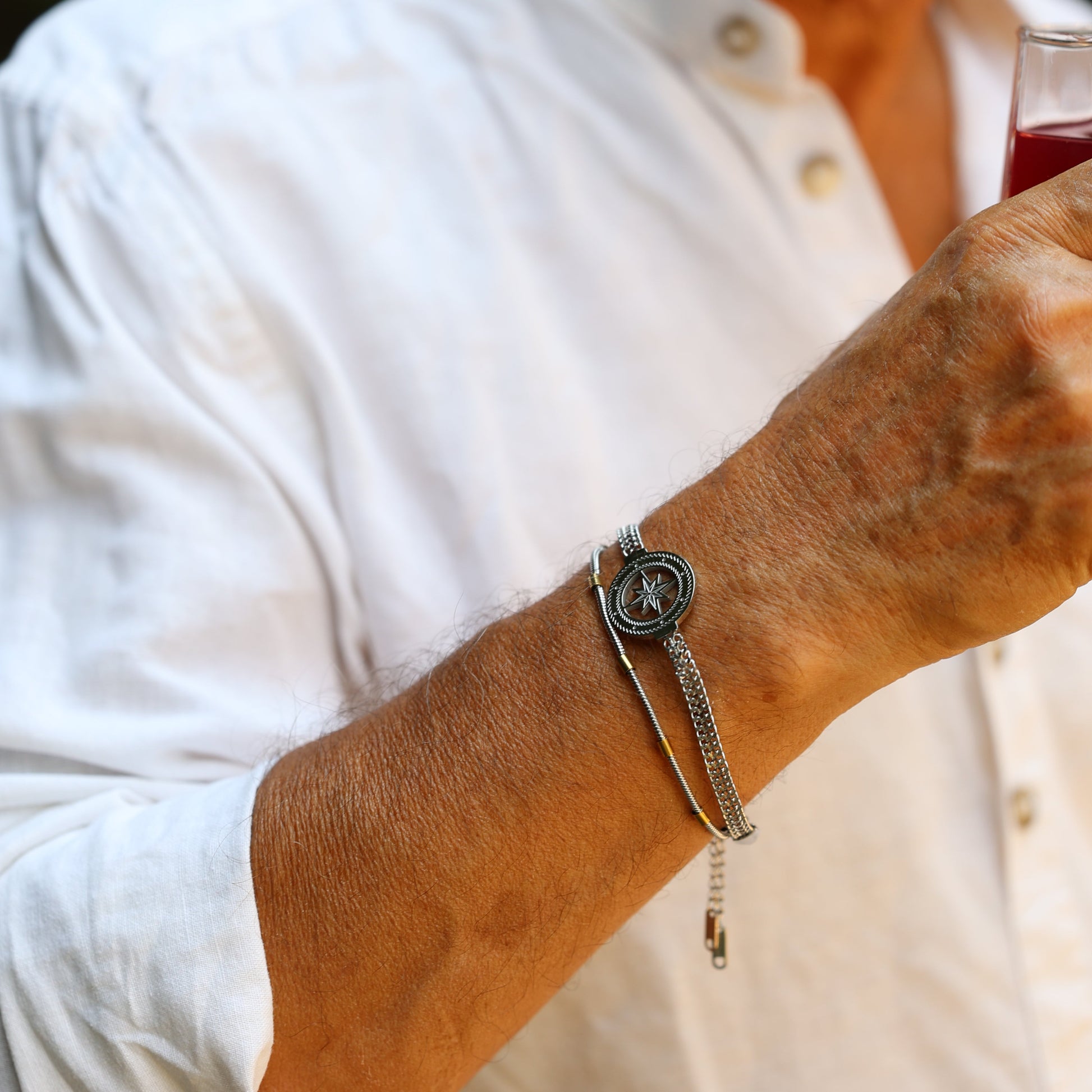 Guided by the brilliance of the North Star, the North Aegis Bracelet symbolizes protection and direction. With its precise laser-cut star design and strong double-chain structure, it represents both elegance and resilience. Perfect for everyday wear, it’s a piece that speaks to those who navigate life with clarity and strength.