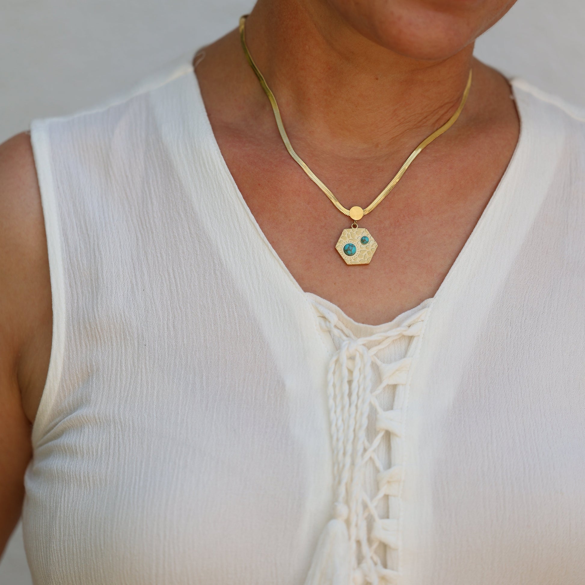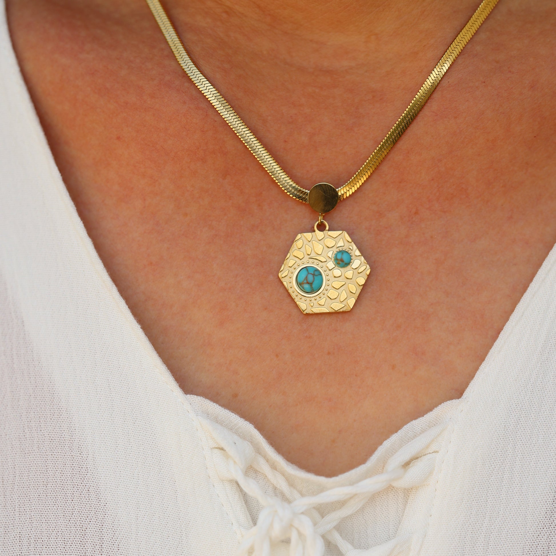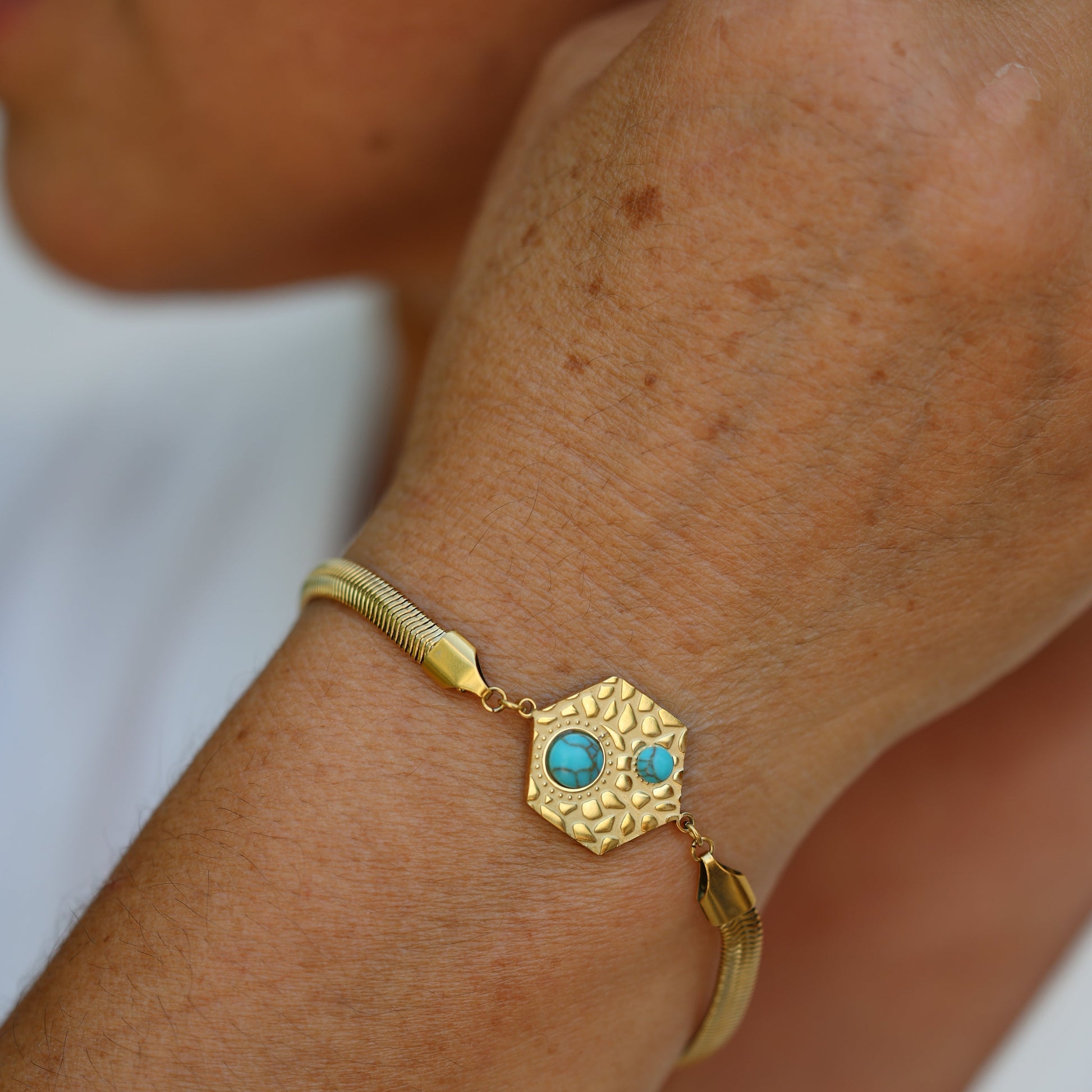 Material: Stainless steel with 14K gold plating, turquoise-colored synthetic stones