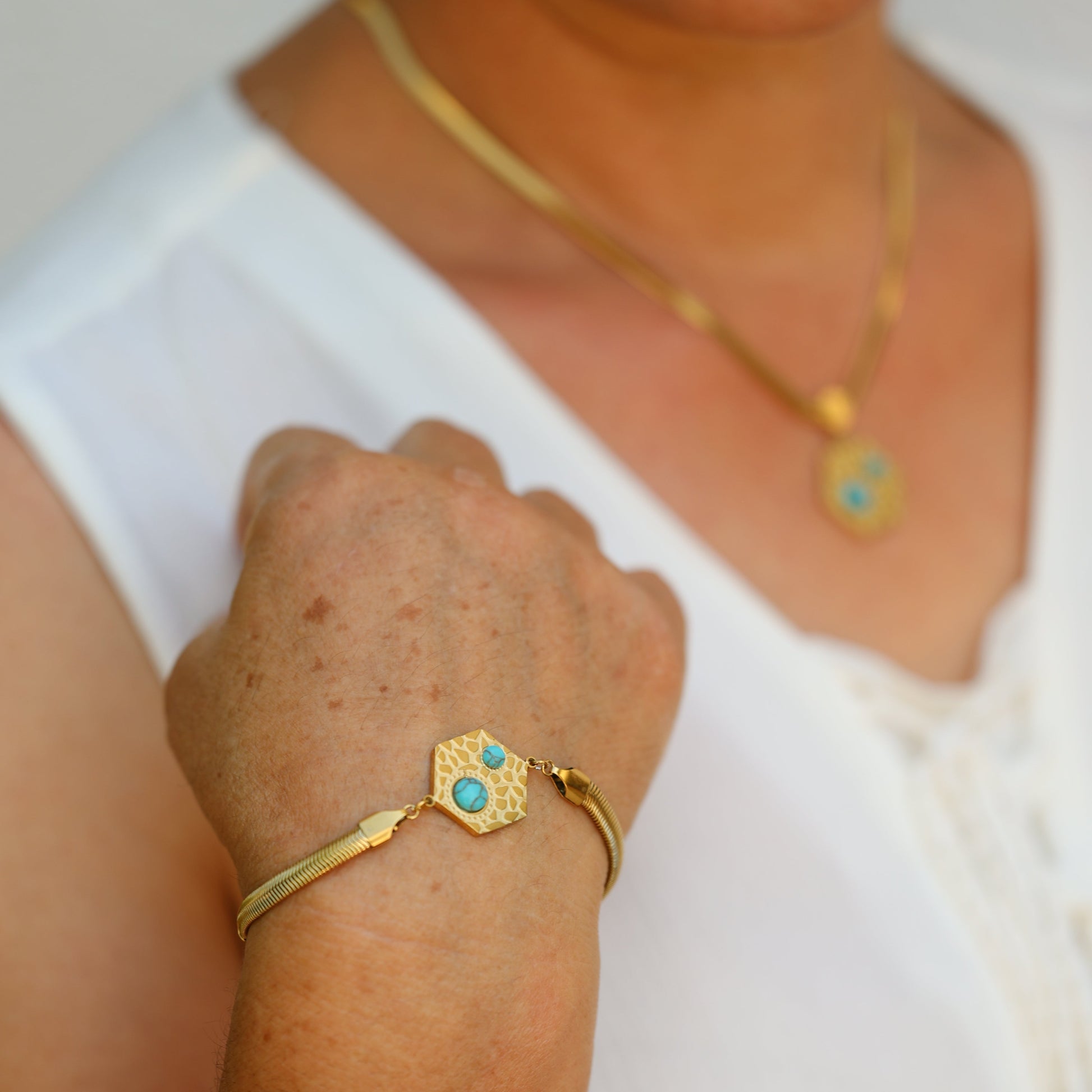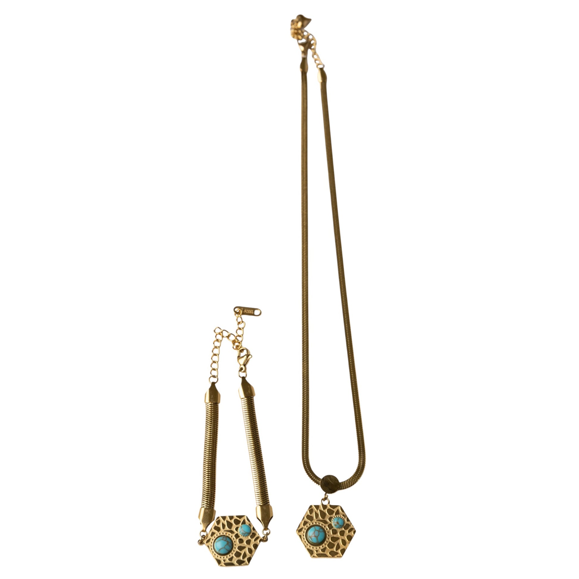 Echoing the mystery of desert landscapes, the Sahara Bloom Set embodies resilience and beauty rising from arid sands. The intricate design mirrors the blooming life hidden within the Sahara, while turquoise stones symbolize vitality and timeless elegance.