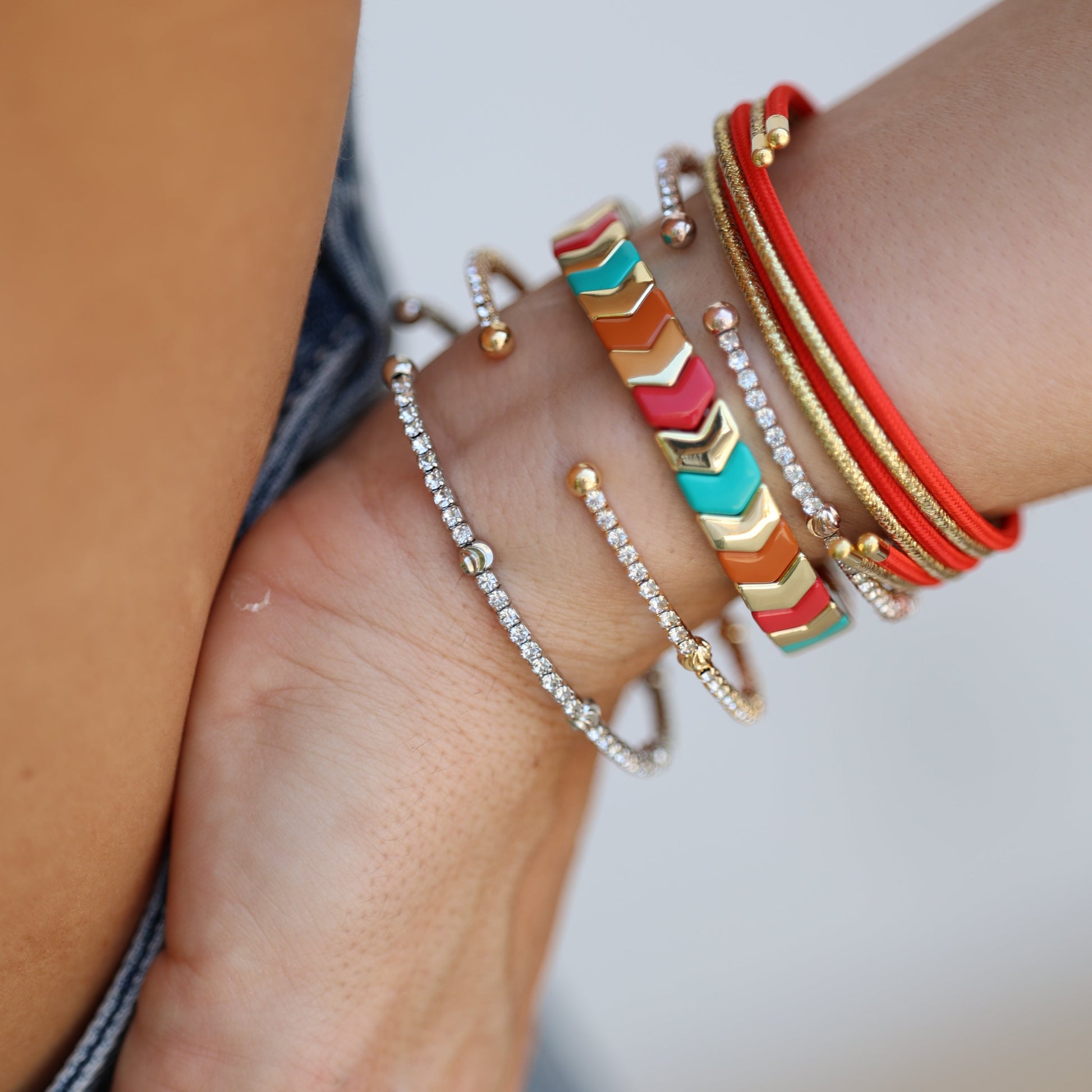 Bring a burst of colour to your everyday style with the Ziggy Pop Bracelet. Designed with a series of chevron-shaped links, this bracelet blends gold-plated accents with bold enamel hues in turquoise, coral, red, and earthy tones. Its stretchable structure ensures a comfortable fit while its vibrant palette adds a touch of fun and individuality to any outfit. Perfect for stacking or wearing solo as a statement piece.